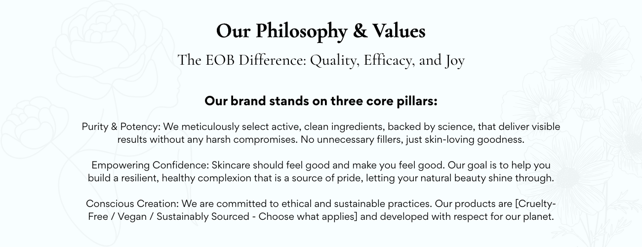 Today, EOB is dedicated to offering products that are not only effective but that infuse your daily routine with a moment of self-love and luxury. We're proud to bring you a meticulously curated collection that helps you embrace your natural brilliance, because when you feel beautiful and confident, you become truly unstoppable.
